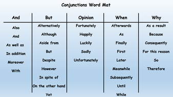 This list of conjunctions ks2 word mat is a great way for students to revise the key list of conjunctions in their writing nbsp this list of conjunctions ks2 word mat could be placed in front of a student as individual support when they are writing or displayed around the classroom to act as a memory jog for all students conjunctions are words that help you link together sentences clauses or.